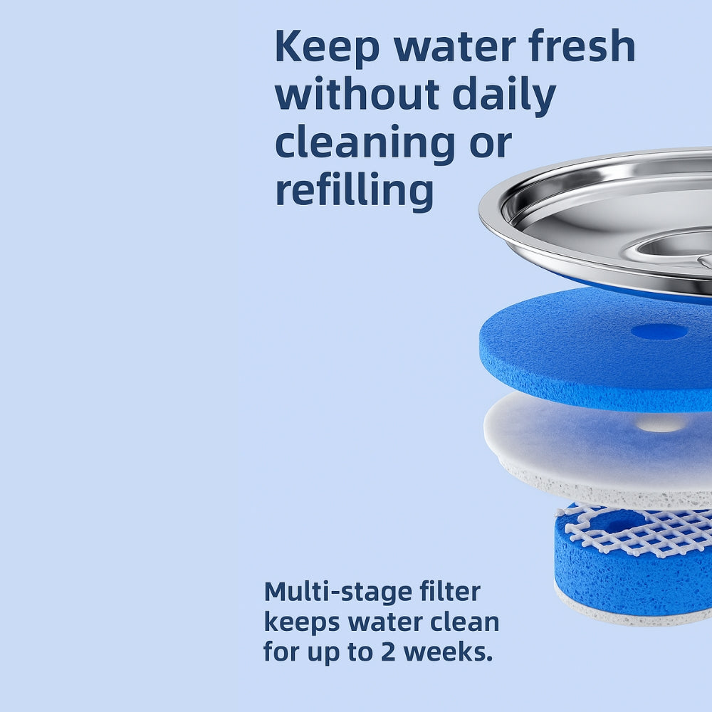 With its 2-litre capacity, most cats and small dogs can go 5–7 days before a refill. For multi-pet households, check the water level every 2–3 days.